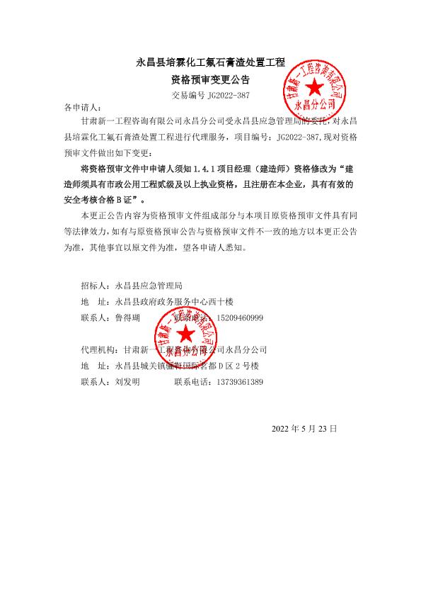 永昌县培霖化工氟石膏渣处置工程资格预审变更公告