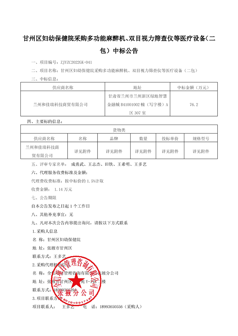 甘州区妇幼保健院采购多功能麻醉机、双目视力筛查仪等医疗设备(三包)中标公示