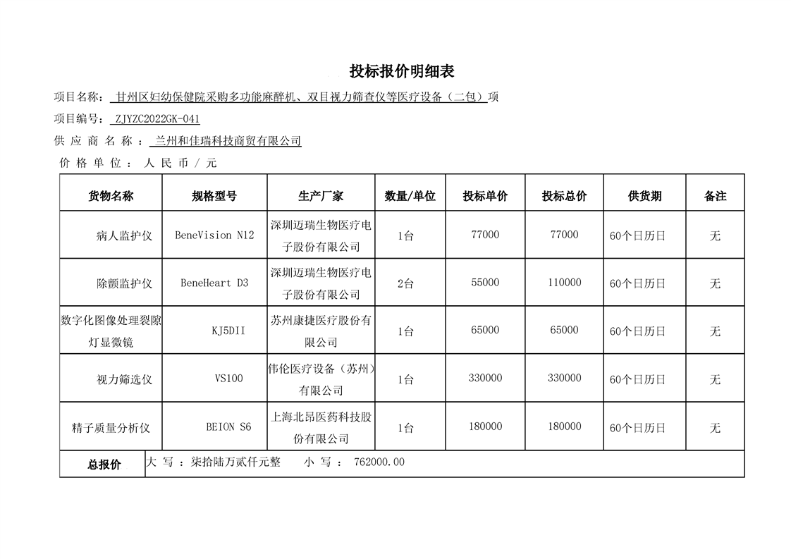甘州区妇幼保健院采购多功能麻醉机、双目视力筛查仪等医疗设备(二包)中标公示