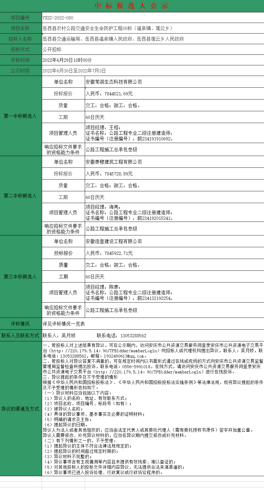 岳西县农村公路交通安全生命防护工程05标(温泉镇、莲云乡)中标候选人公示